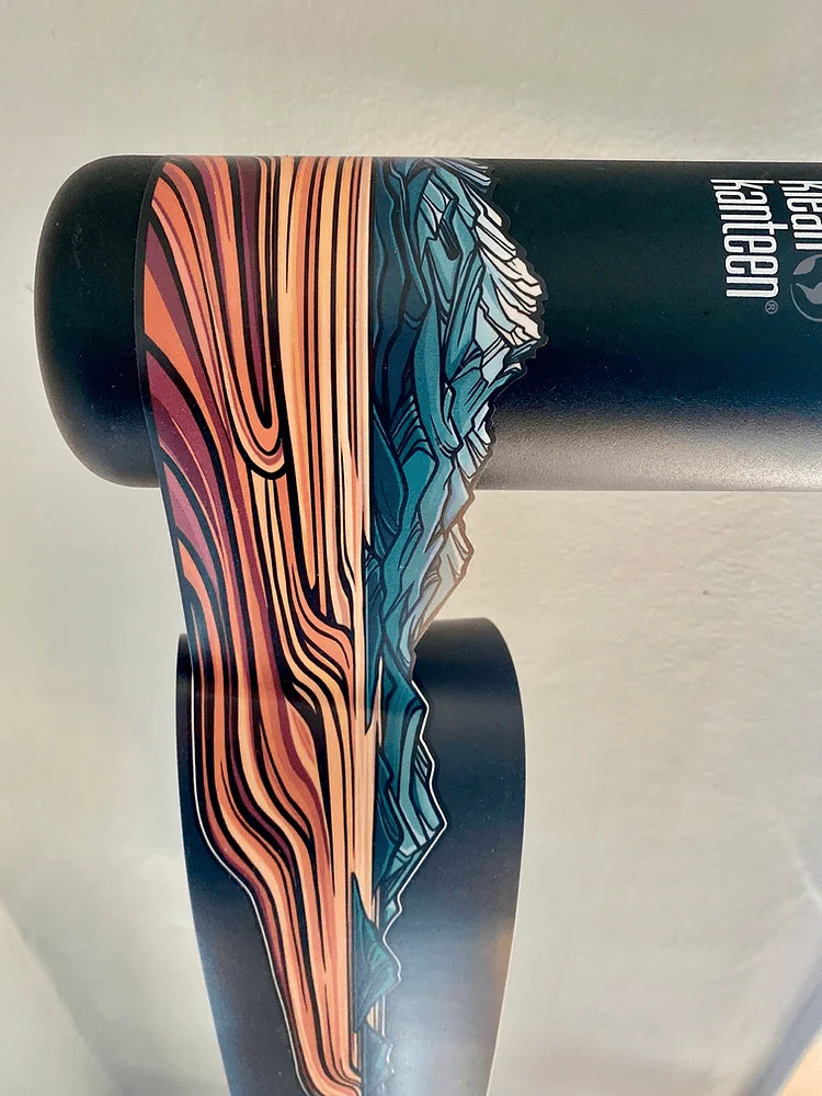 This one-of-a-kind extra, long sticker is designed to wrap around itself to create an INFINITE LANDSCAPE on any size of bottle! As you rotate your bottle, you will see no beginning and no end to your sticker- just a colorful, unique landscape! This super durable sticker also looks awesome on skis, boards, cars, coolers, racks and beyond!